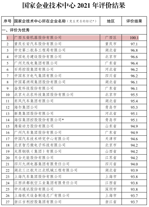 2021年国家企业技术中心评价结果 玉柴位列全国第一
