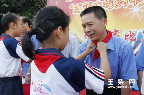 在育才中学,附小的全体学生们排着整齐的队伍,用掌声欢迎玉柴叔叔们的到来。学生代表还为玉柴叔叔系上了红领巾。随后,玉柴领导为2014年度的“五好少年”颁奖。