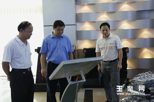 叶斌陪同李志林(左一)观看玉柴展机。