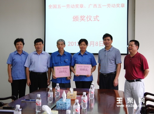 6月8日,玉林市总工会党组书记、副主席卢道东、玉林市总工会副主席杨发伟等来玉柴慰问全国“五一劳动奖章”获得者陈秋平、广西区“五一劳动奖章”获得者梁春威,并给他们颁发奖金。
