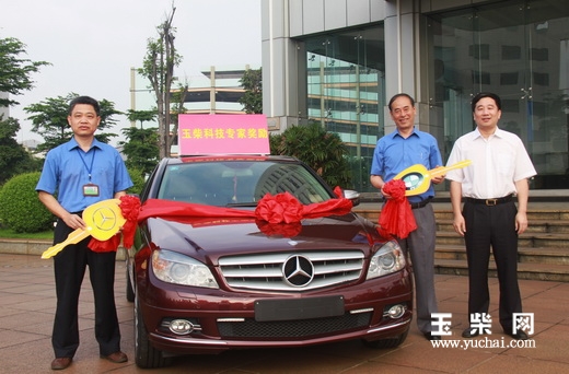 5月7日,玉柴机器股份有限公司在动力大厦广场举行嘉奖科技专家颁奖仪式,董事长高级技术顾问沈捷、卓斌两位科技专家分别获得一辆价值50万元的轿车奖励。这是股份公司对沈捷、卓斌两位专家在大马力船用和发电用发动机、新能源动力研发方面所作出的突出贡献的奖励。集团公司董事局主席、股份公司董事长晏平分别为两位专家颁发了轿车钥匙模型。这是公司继上月21号百万元奖励高技能人才后,今年又一次对专业人才给予的重大奖励,表明了玉柴对有突出贡献人才的认可和重视。