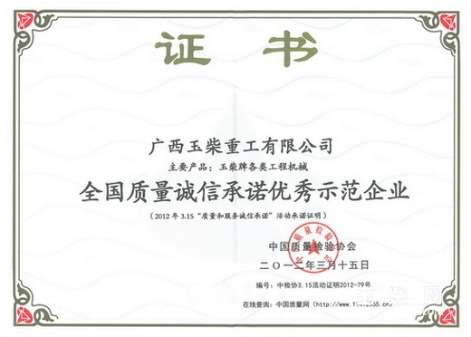 近日,从国家质量监督检验检疫总局产品质量申诉处理中心和中国质量检验协会传来捷报,玉柴重工荣获“全国质量诚信承诺优秀示范企业”称号。