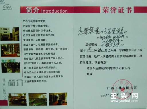 近日,玉林市图书馆给玉柴颁发荣誉证书,感谢玉柴捐赠的《玉柴建设者》、《玉柴故事》、《散文玉柴》、《新使命·新征程》等图书。