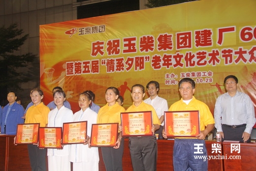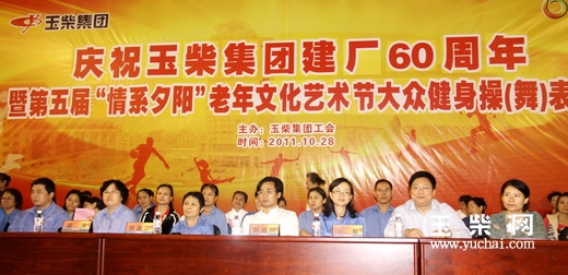 10月28日晚,为庆祝玉柴集团建厂60周年,表达离退休老职工对玉柴集团的祝福,玉柴集团的离退休老职工在玉柴灯光球场奉献了一场精彩纷呈的“情系夕阳”老年文化艺术节大众健身操(舞)表演活动。玉柴集团公司党委副书记张嘉莎、郭德明,集团公司工会主席梁萍等人出席了本次活动。