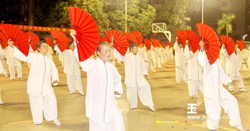 当晚,老龄办、老年大学以及玉柴各生活区的约400多名离退休老职工组成的6个代表队为观众上演了《中国功夫扇》、《太极拳表演》、《活力健身操》、《柔力球》等7个健身操(舞)节目。