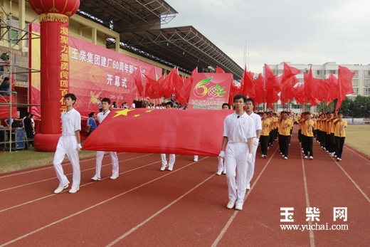8时许,在《运动员进行曲》的激昂旋律中,8名青年职工庄严地手托中华人民共和国国旗和玉柴60周年厂庆标牌,迈着整齐的步伐入场,紧接着红旗队、鲜花队以及集团各单位代表队相继入场,受到全场观众的热情欢迎。从主席台前经过时,不少代表队还高喊口号,展现了良好的团队精神。