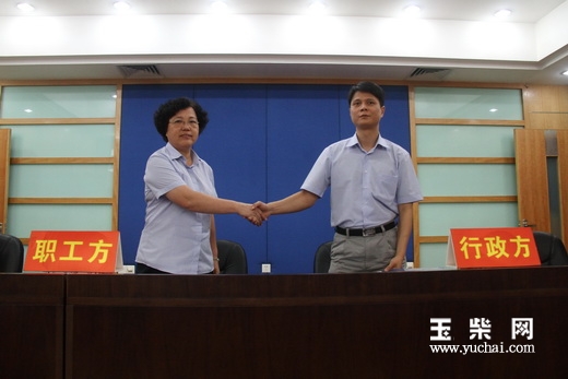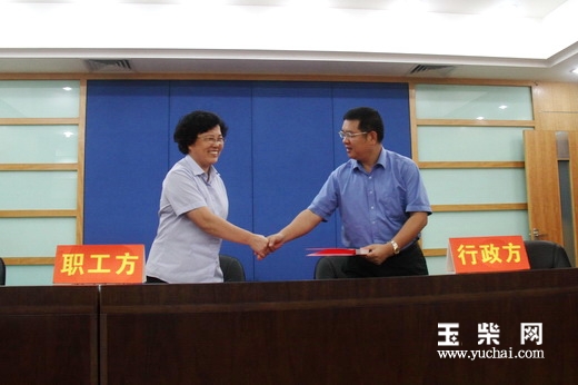 7月20日下午,玉柴集团公司、股份公司新一轮(2011-2014年)集体合同和女职工专项集体合同签订仪式在动力大厦三楼会议室举行。在玉柴集团党委副书记张嘉莎的主持下,玉柴集团公司用人方委托代理人古堂生,玉柴股份公司用人方委托代理人吴其伟分别与玉柴集团公司、玉柴股份公司职工方首席代表、工会法定代表人梁萍签订了集体合同和女工专项集体合同。