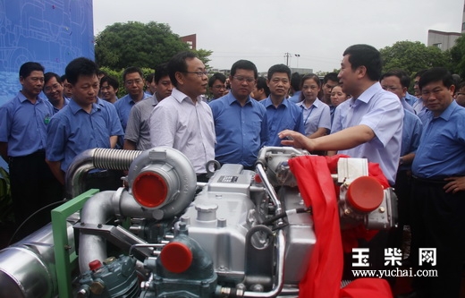 玉柴集团董事局主席晏平、国家轿车质量监督检验中心(天津汽车检测中心)副主任史永万、天津大学内燃机燃烧学国家重点实验室主任尧命发、玉柴机器股份有限公司总经理吴其伟一同掀开了红绸,向世人展示了中国首台欧VI车用柴油机。