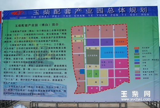 玉柴配套产业园位于博白县城东工业集中区,占地面积约7500亩,总投资75亿元,将按“一个中心,三个重点,五大功能”定位进行规划和建设,即以服务和配套玉柴核心产业为中心,重点发展发动机零部件、职业技术教育和新能源新材料三大产业,力争用五年时间打造成为集生产制造、技能实训、仓储租赁、创业投资、商贸旅游五大功能于一体的生态型综合配套产业园。