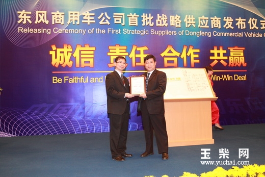 近日,玉柴参加了东风商用车公司在广西桂林召开的2011年度供应商大会。会上,东风商用车公司对2010年度优秀供应商进行了表彰,同时举行了首批战略供应商发布仪式,玉柴被评为“最佳供应商”,并且成为东风商用车公司首批战略合作供应商之一,双方的合作进一步紧密和深化。玉柴股份有限公司总经理李天生出席了本次大会。