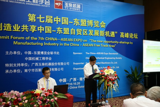 由中国-东盟博览会秘书处、中国机械工程学会共同主办,玉柴股份公司支持协办的第七届中国—东盟博览会“装备制造业共享中国—东盟自由贸易区发展”高峰论坛于10月20日下午,在南宁国际会展中心会议室举行。