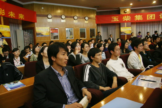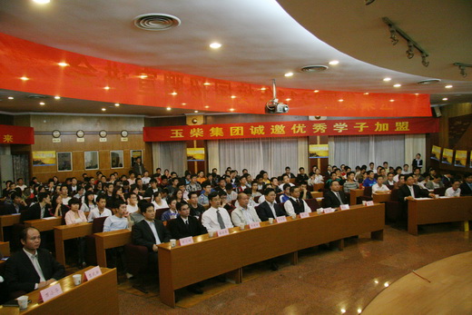 金秋十月,玉柴集团校园招聘进入紧锣密鼓的冲刺阶段。10月11日晚上,玉柴在华中科技大学国际学术交流中心三楼学术报告厅举办2011年校园招聘宣讲会, 华中科技大学学生处处长祝欣、科学技术发展院横向开发与科技合作处处长夏向东等学校领导以及玉柴股份公司总经济师王炜、党委副书记郭德明、工程研究院副院长谭达辉、玉柴重工副总经理张运泉、玉柴华原公司董事长张文等玉柴领导出席宣讲会。