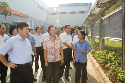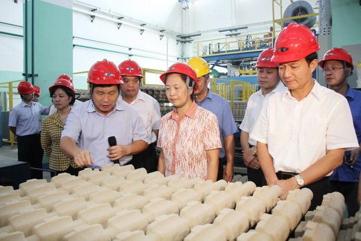 陈际瓦来到玉柴铸造中心,对崭新、宽敞的厂房和先进的生产设备产生了兴趣,她站在自动化生产设备前,向李天生了解铸造中心的生产情况。李天生简明扼要地向陈际瓦一行介绍了玉柴的生产经营情况。