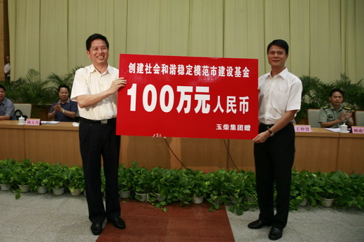 8月30日,在玉林市社会治安综合治理工作会议上,玉柴集团公司总裁古堂生代表玉柴集团向玉林市综治委捐资100万元,作为创建社会和谐稳定模范市建设基金。玉柴法顾部部长陈卫国代表玉柴参会。