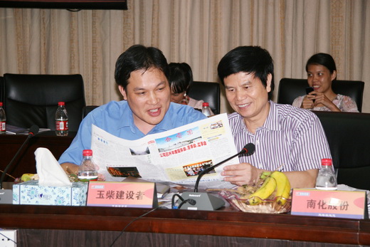 玉柴集团公司宣传部部长何晓宇(左)与广西企业报研究会会长李志权(右)一起品评企业报