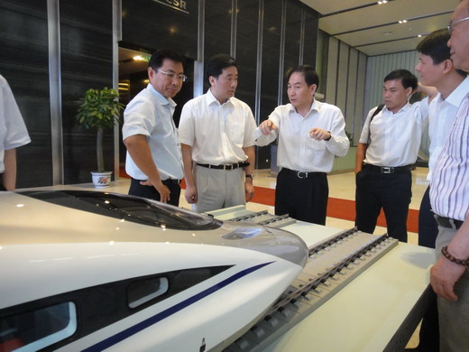 赵小刚(左三)、郑昌泓(左一)向晏平(左二)讲解CRH-380A型动车组