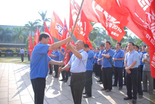张士勇宣布玉柴重工“感恩之旅—关爱2010”正式启动。顿时,礼炮齐鸣,五彩的礼花在空中绽放。在激昂的《超越梦想》乐曲声中,张士勇为12个服务活动小组代表授旗,仪式达到了高潮。12个服务活动小组一一接过旗帜,鲜艳的旗帜迎风招展,映红了服务活动小组代表坚毅的脸庞。