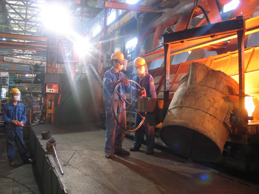 熔化工段每个岗位都是和高温铁水打交道的。熔化工人的三件宝:阻燃服、防护面罩、防护脚罩,一件都不少;出铁水、捞渣、浇注、点火,工人们的动作是那么的娴熟。他们脸上流着汗水的同时,也流淌着坚强的意志。
