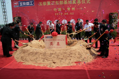 2010年6月2日,随着轰鸣的礼炮声在江苏省常州市武进区蔚蓝的天空中响起,广西玉柴重工有限公司(以下简称“玉柴重工”)发展史上重要的项目——玉柴重工东部基地在武进高新区正式开工。江苏省省长罗志军代表省人民政府专门发来贺信表示热烈祝贺,中国工程机械工业协会会长祁俊,中国工程机械协会挖掘机械分会秘书长李宏宝,常州市、武进区领导,玉柴集团公司董事局副主席李天生,玉柴重工副董事长洪德尚、总经理张士勇等领导,以及供应商、经销商代表,玉柴重工东部基地全体员工出席了奠基仪式。