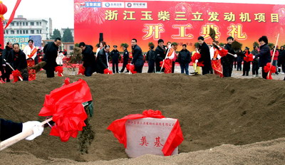 浙江玉柴三立发动机项目是由广西玉柴机器股份有限公司、浙江吉利控股集团有限公司、浙江银轮机械股份有限公司三家上市企业共同出资合作建设。18日当天,位于天台县始丰街道铁山头的浙江玉柴三立发动机项目建设工地上彩旗飘扬、鞭炮齐鸣,激昂的锣鼓、劲舞的彩狮、五彩的气球呈现出一派喜庆气氛。上午10时,开工典礼正式开始,天台县领导、项目三方代表分别致辞。徐鸣华首先在仪式上致贺词,祝贺玉柴三立发动机项目的正式动工,要求天台县有关部门、单位,都要以满腔的热情、最大的诚意和务实的态度,倾力为项目建设搞好服务。梁萍在致辞中表示,玉柴一定会认认真真、兢兢业业和合资方把项目建设好,促使项目早日投产,努力将浙江玉柴三立发动机股份有限公司打造成为具有国内高新技术品牌的轿车柴油发动机生产基地和龙头企业,早日实现“三赢”局面!杨健在致辞中表示,台州是吉利的发源地,台州人坚持现场现地服务的务实态度,更加坚定了吉利在台州做大做强的信心。徐小敏在致辞中也表示,对中国汽车市场未来的发展有信心,对玉柴三立发动机项目未来的发展充满信心,项目一定会在天台这块沃土上结出丰硕的果实,成为国际上一流的柴油发动机工厂!
