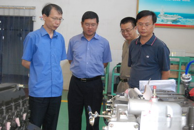 覃柳明(左一)在吴其伟(左二)陪同下考察玉柴产品