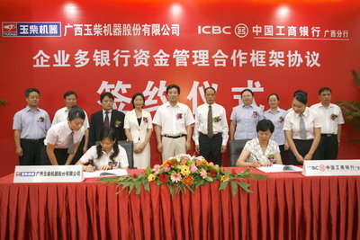 7月16日下午,玉柴机器股份有限公司与工商银行广西分行企业多银行资金管理合作框架协议签约仪式在玉林宾馆隆重举行。工商银行广西分行副行长许桂北、玉柴机器股份有限公司总会计师覃小红在协议上郑重签字,工商银行总行电子银行部副总经理龙春玲、工商银行广西分行行长张恪理,玉柴机器集团公司董事局主席晏平、副总裁苏朋、总会计师汪虹以及工商银行广西分行、工商银行玉林分行、玉柴机器股份有限公司财务部等相关领导共同见证了这一重要的时刻。