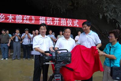 6月26日上午,美丽神奇的凤山县飘着丝丝清凉的夏雨,在当地著名的喀斯特地貌景观巨型溶岩石桥中,高高的桥顶上悬着形状各异的钟乳石,顺着钟乳石滑落的水珠,滴入桥下清澈见底的溶洞河水中,而在这钟乳石和畅流的河水中间的看台上,主旋律电影《壮乡木棉红》的开机仪式正在隆重举行中。