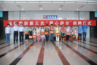 玉柴集团公司女工主任郭诗娟在主持捐赠仪式时说,玉柴集团公司工会一直都致力于对困难、特困职工的帮扶工作,自2007年开始在全体职工中开展“我献一份爱心,创建和谐社会”为主题的爱心超市捐赠活动以来,得到了职工们的大力支持和响应,职工们纷纷向“爱心超市”捐赠了闲置的日用品、生活物资和小家电、学习用具等,并踊跃捐款。玉柴集团公司工会已经连续开展了3年的爱心超市捐赠活动,共有105名特困职工子女得到了捐赠。今后,玉柴集团公司工会将继续完善“爱心超市”工作长效机制,动员更多单位和个人参与到此项活动中来,将温暖带给最需要帮助的职工。
