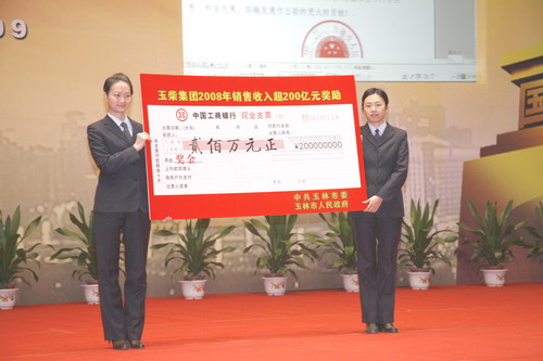 2008年,玉柴集团积极贯彻实施玉林市委、市政府“强柴兴玉”战略,在全球经济饱受金融危机冲击、汽车行业整体低迷的情况下,实现年度销售收入超过200亿元,成为玉林市首家年度销售收入超过200亿元大关的企业,有力带动了全市工业经济快速发展,为玉林经济社会实现又好又快发展做出了卓越贡献。为此,玉林市人民政府发布嘉奖令对玉柴予以表彰,并奖励玉柴集团200万元。