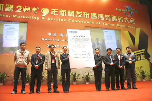 作为民族发动机企业代表,玉柴一直致力于努力承担民族产业振兴,创造人类、社会与自然和谐的责任。在玉柴机器2009年新闻发布暨营销服务大会上,玉柴代表李天生,配套玉柴发动机的主机厂代表蒋朝友、任文社、黄祥全,YC配套供应商联合会代表樊江,YC服务体代表丛晓峰,分别在“社会责任共同承诺书”上签名。