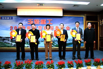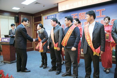会议认真总结了公司2008年的营销与服务工作,列举了公司2009年营销服务、产品研发、产品质量等方面工作的重点。夏禹武宣布了对2008年公司全体经销商在营销服务工作中的先进集体和个人的表彰,对10名在2008年销售服务工作中的先进个人分别授予“玉柴重工服务标兵”、“玉柴重工销售标兵”称号,分别奖励现金10000元,张士勇、边德军为获奖标兵颁奖;对10个在2008年销售服务工作中表现突出的经销商和服务站分别授予“玉柴重工优秀经销商”、“玉柴重工金牌服务站”称号,分别奖励轿车1辆,晏平、古堂生分别为获奖经销商和服务站授匾和发放轿车钥匙,并鼓励他们发挥榜样作用,为在2009年取得更好的业绩而继续努力。