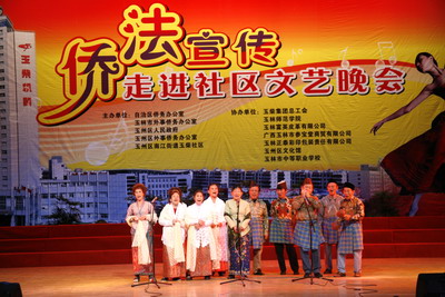 为进一步推动侨法的学习宣传和贯彻落实,12月22日晚,由自治区侨办、玉林市侨办、玉州区侨办和玉柴社区联合主办的“侨法宣传走进社区文艺晚会”在玉柴文化中心隆重上演。自治区侨办副主任钟志英,玉林市人民政府副秘书长吴玉棋,玉州区委副书记梁志勋,玉柴社区主任曾庆光等领导出席了晚会并先后为晚会致辞。