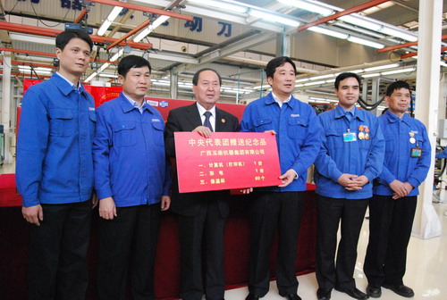 司马义·铁力瓦尔地(左三)中央代表团向玉柴职工赠送了纪念品