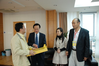晏平(左一)接受陈祖德(左二)赠送的棋盘
