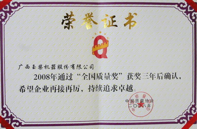 11月6日,全国质量奖审定委员会发布公告,宣布广西玉柴机器股份有限公司等7家企业通过全国质量奖获奖三年后确认。同时,玉柴股份公司还荣获“2008年全国实施卓越绩效模式先进企业”荣誉,这是该公司第四次获此荣誉,标志其经营管理持续保持行业标杆地位。