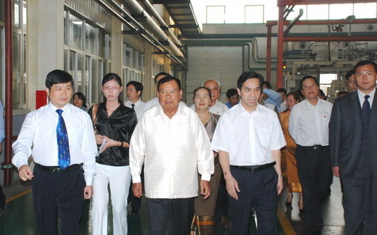老挝国家副主席本扬·沃拉吉(前左二)在李天生(前左一)陪同下参观玉柴生产车间