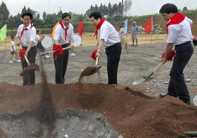 晏平(右二)、玉柴集司副总经理李汉阳(右一)与资阳市领导为玉柴希望小学奠基培土