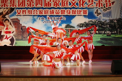 我健康,我美丽。我运动,我快乐。8月26日晚,在玉柴文化中心礼堂内,节奏强劲的音乐阵阵响起,玉柴集团第四届家庭文化艺术节女性家庭成员健身操比赛正在这里举行,来自采购部、冷加工厂、配件公司、动力公司、铸造厂、老龄办等共17支代表队的一个个动感活力的健身操节目充分体现了玉柴女工的自信与风采。
