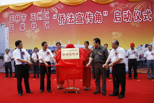 7月18日上午,由国务院侨务办公室和自治区侨务办公室主办的“侨法宣传角”在玉柴社区正式启动,国务院侨务办公室国内司副司长赵昆,自治区侨办副主任韦谦,市委常委、常务副市长刘子福,市人大常委会副主任吕汉江,市政协副主席、玉柴董事长晏平出席启动仪式并为“侨法宣传角”揭牌。