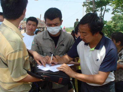 罗建平(中)在为灾民义务服务