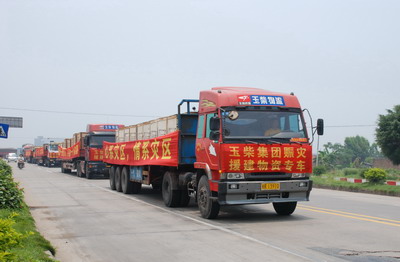 6月2日中午11:30,玉柴集团在动力广场举行赈灾援建四川灾区物资发运仪式。简单的仪式过后,紧随玉林市委书记文明一声“起运”,一辆辆满载着捐赠的发电机组和挖掘机的16米大货车缓缓启程,承载着玉柴集团及其18000名员工的深情厚谊一同发往四川灾区。据悉,玉柴集团向四川地震灾区捐款捐物总价值超过1500万元,所有物资将陆续送往灾区。
