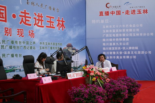 11月17日,在美丽的玉林江南公园,中央电台“中国之声”品牌栏目《直播中国》走进玉林,全方位宣传报道玉林市成立10年来所取得的巨大成就,玉柴晏平董事长与玉林市委书记文明、市长金湘军等主要领导以及专家走进直播室,向全国听众真情诠释玉林的和谐与发展,晏平董事长在节目中也向全国的听众介绍了玉柴的发展战略和文化理念。