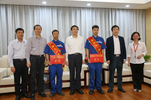 黄海昆为张锦成和李国华分别颁发全国五一劳动奖章奖金、广西五一劳动奖章奖金,希望他们把参加全国、自治区相关会议的精神及时传达,通过典型示范和榜样的力量,带动和影响更多的人通过劳动创造价值、创造幸福、创造财富。