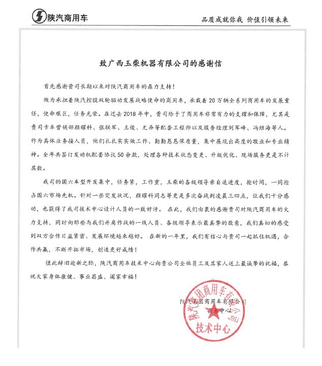 随着国家更严苛排放法规实施期的临近,发动机市场战在不断升级。玉柴全面实施战略部署,与国内主流整车企业强强联手,纵深推进战略业务合作,共同迎接排放升级带来的挑战。以客户为中心、为客户创造价值是我们倡导的价值观。在推进战略合作、具体业务的过程中,我们的工作人员积极践行价值观,表现出了高度的敬业精神和专业精神,获得了合作方的点赞。1月28日,公司党委办收到陕汽集团商用车有限公司技术中心发来的感谢信。对玉柴工作人员来说,这是客户给予的最厚重的新春礼物。
