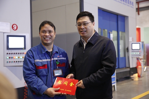韦韬首先来到玉柴快速制造基地,为前不久入选中国机械工业百名工匠的覃懋华送上慰问品、慰问金和节日祝福。韦韬走进车间,和覃懋华亲切交谈,详细了解以覃懋华为代表的技术先模的工作和生活情况。他表示,正是因为覃懋华等技术先模的辛勤付出,玉林机械工业才得以发展壮大。他希望玉柴继续大力弘扬劳模精神、工匠精神和劳动精神,不断提升技能人才的职业素养和职业技能,为他们提供各尽其才的事业舞台,让工匠精神在玉林发扬光大,同时助力玉林机械工业的快速发展。