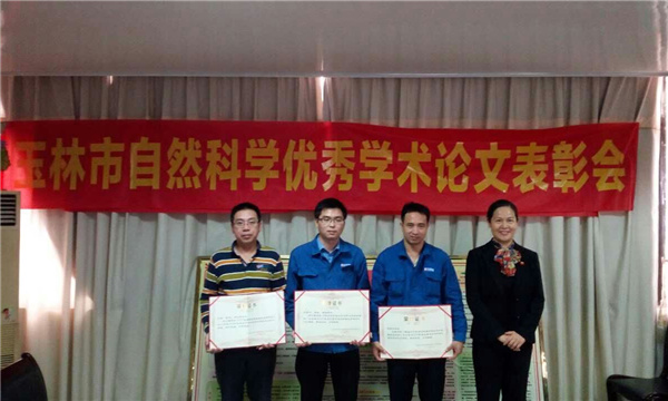 1月9日,玉林市隆重召开2016年度自然科学优秀学术论文表彰奖励大会,全市共评出一等奖5篇、二等奖15篇、三等奖40篇。由玉柴科技协会、玉柴技师协会组织送评的自然科学论文中共有12篇入围获奖,其中一等奖1篇、二等奖3篇、三等奖8篇,占全市获奖总数的20%,获奖项目同比去年增长140%,创造历年最好水平,这是玉柴科技成果工作成效的又一次突破。