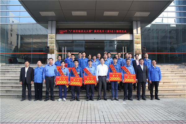 玉柴集团隆重嘉奖在2016年广西技能状元大赛中获得全区前五名的工人,向他们颁发了总价值约为35万元的奖金和奖品,共有19名工人获得嘉奖。集团公司董事局主席晏平、党委书记李汉阳,玉柴股份党委书记宁兴勇等公司领导为受嘉奖的工人颁奖。