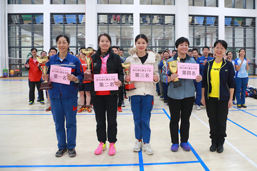 闭幕式上,关敏为荣获健康家庭一等奖的制造事业部李冲家庭和敖应晓家庭,以及羽毛球赛各组前四名颁奖。