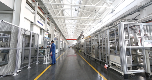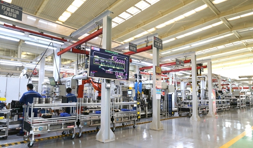在制造事业部五发装配车间,一条非常漂亮的生产线向前延伸,从机器人自动抓起缸体、打码上线到冷却器拧紧、缸套涂油等一系列装配工作全部由机器人完成。这是一条重型发动机智能装配线,采用国际最先进的高精度托盘+辊道方式,核心装配工序采用全轴自动转角拧紧,普通工序采用全电枪拧紧,同时实现了在线智能检测,柔性、自动化率达90%以上。