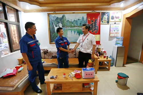 7月17日,集团公司党委书记李汉阳、工会主席关敏带队走访慰问玉柴物业困难党员吴为文。在详细了解吴为文的工作岗位和健康状态后,李汉阳勉励其坚定信心,相信玉柴未来的发展和员工的生活会越来越好,希望他在岗位上继续发挥党员的先锋模范作用。李汉阳要求,基层党组织和工会要细致掌握困难党员的情况与需求,对于身体情况欠佳的员工要合理安排工作岗位,针对性做好帮扶工作,让他们真切感受到党的关怀和组织的温暖。